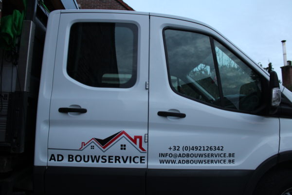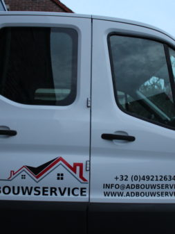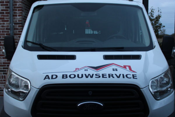 Belettering Werkbus Bestickering Geef uw werkbus een professionele en herkenbare uitstraling. Voor AD Bouwservice zijn logo, slogan en contactgegevens strak aangebracht in een duidelijke, professionele stijl. Tip: Belettering Caddy Fotolijst met logo’s