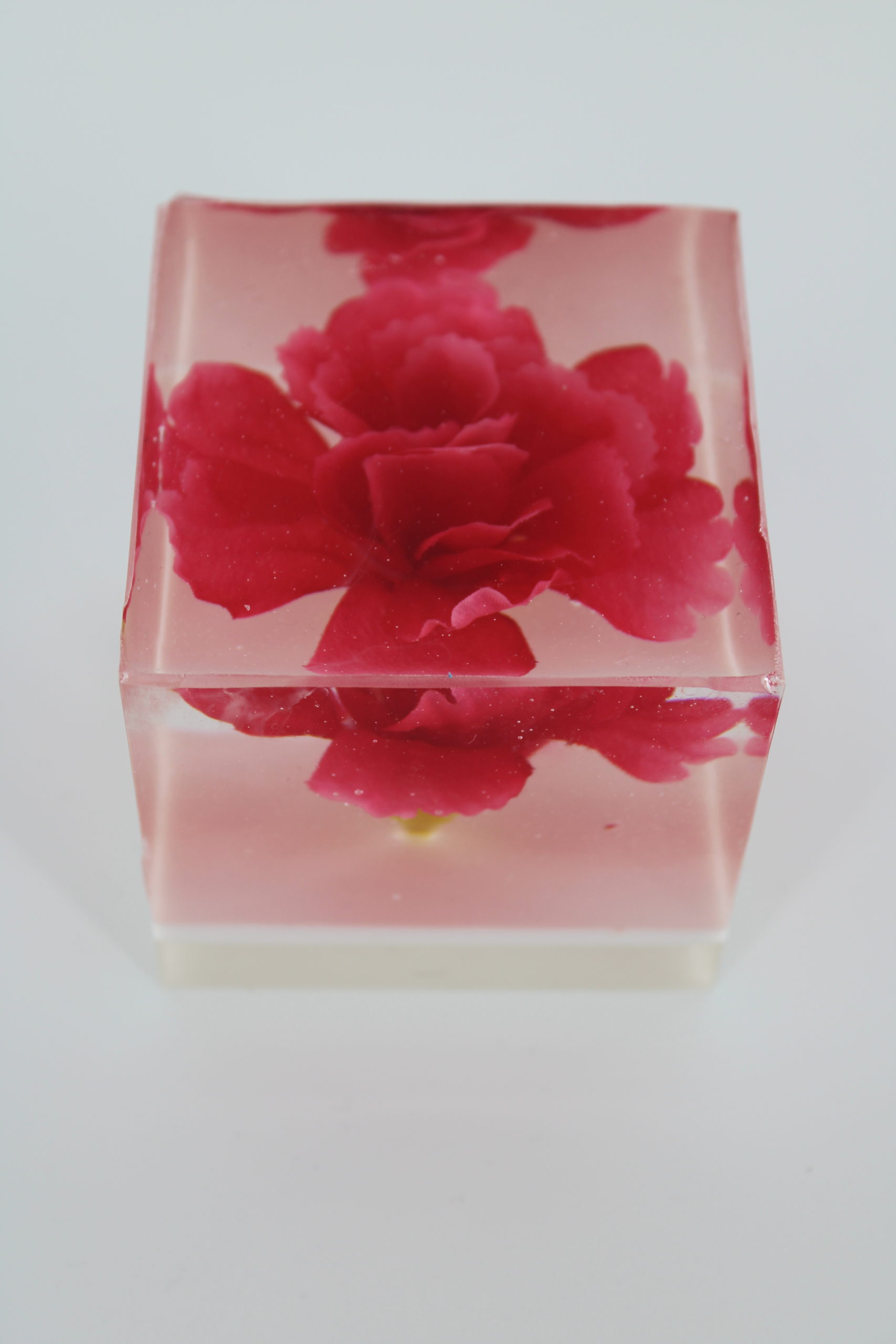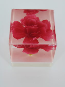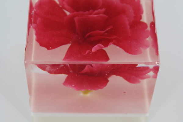 Een heldere epoxy blok met een bloem. Een elegant, handgemaakt decoratief object en uniek cadeau.