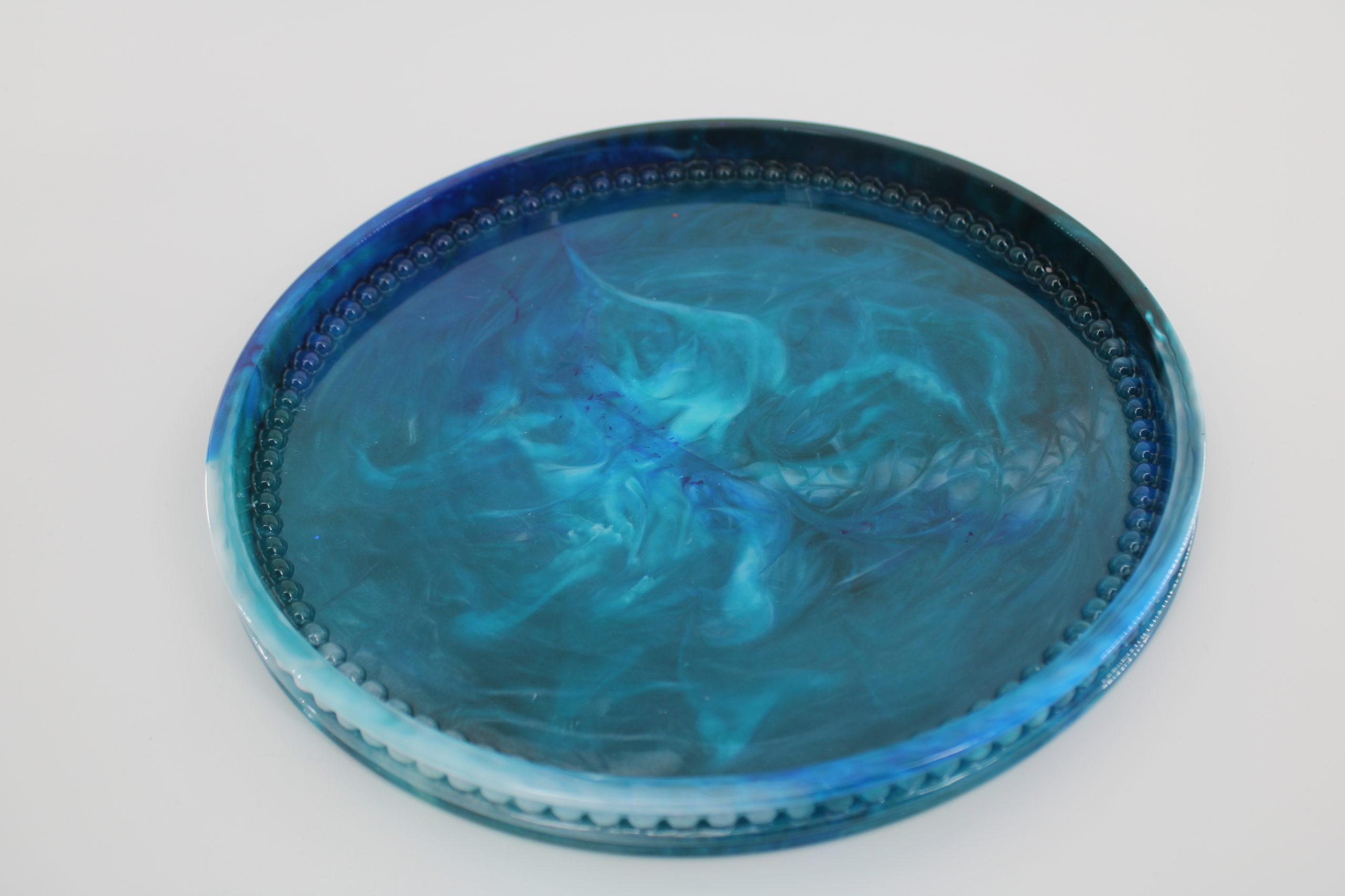 Dienblad groen en blauw tint Epoxy Epoxy dienblad in groen- en blauwtinten met een vloeiend effect. Dienblad festival herinnering Dienblad groen wit
