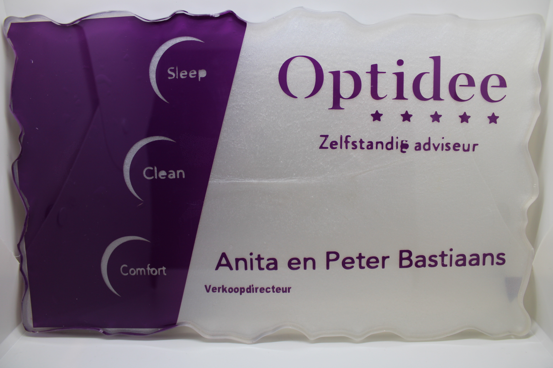 EpoxyStrak presentatie bord in epoxy met het bedrijfslogo. De glanzende toplaag geeft diepte en laat het logo luxe opvallen — perfect voor balie, bureau of etalage en ideaal voor events of beurzen.