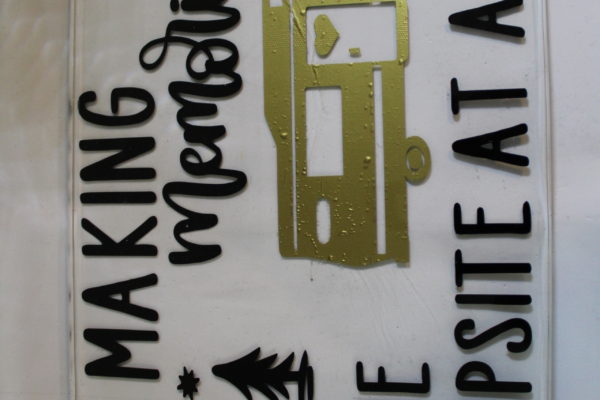 EpoxyHandgemaakt epoxy dienblad met campingprint: stevig, glanzend en makkelijk af te nemen.
