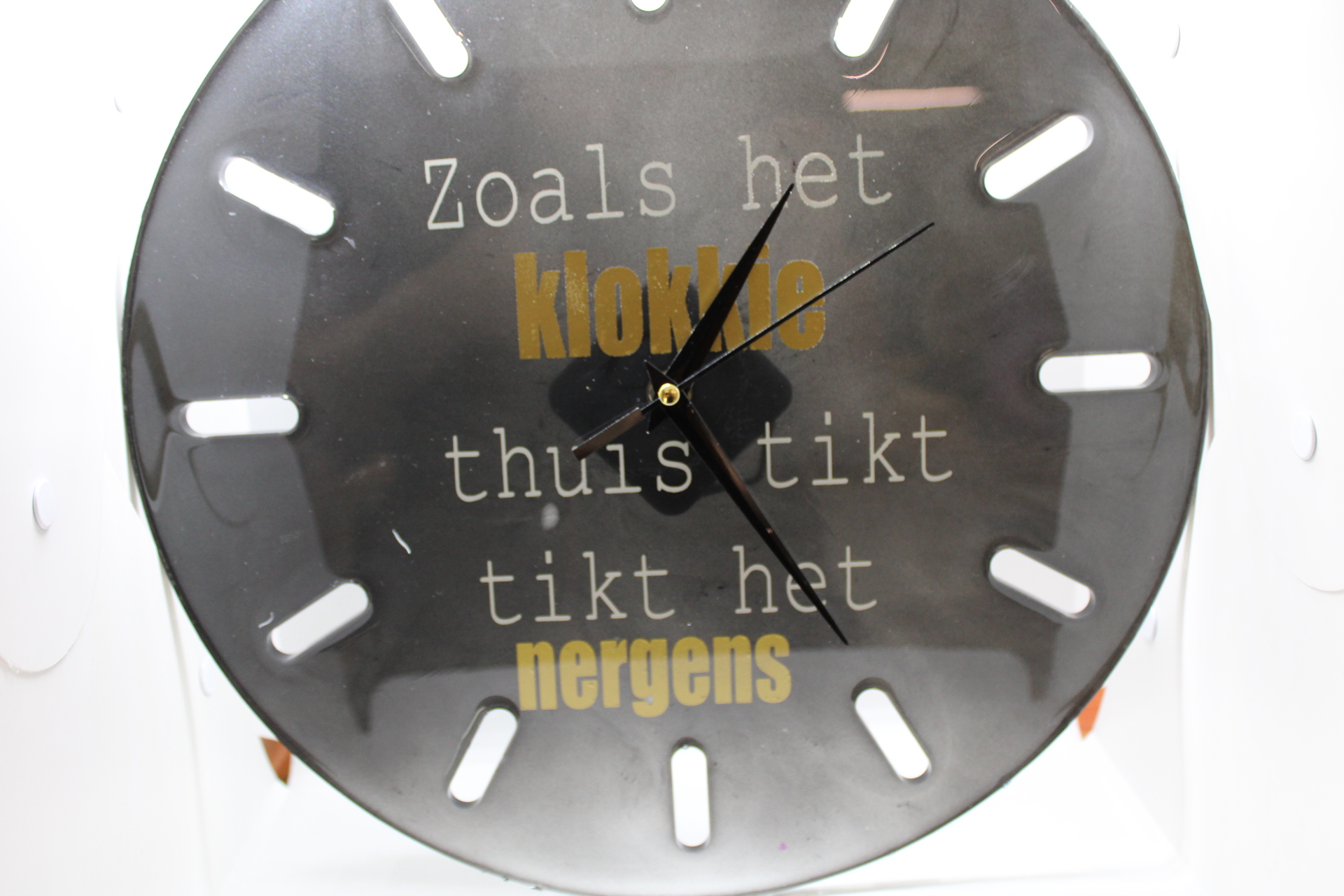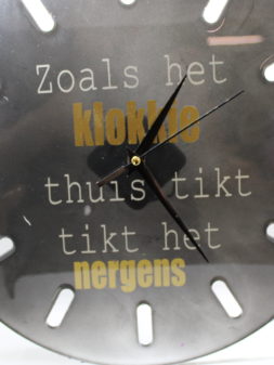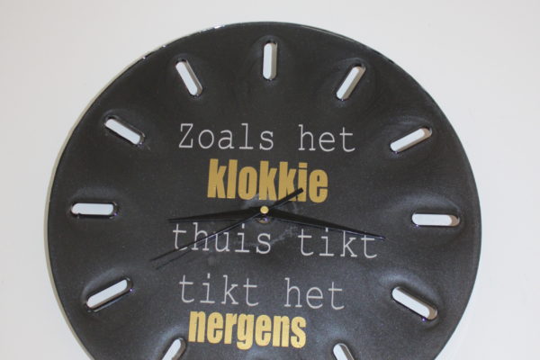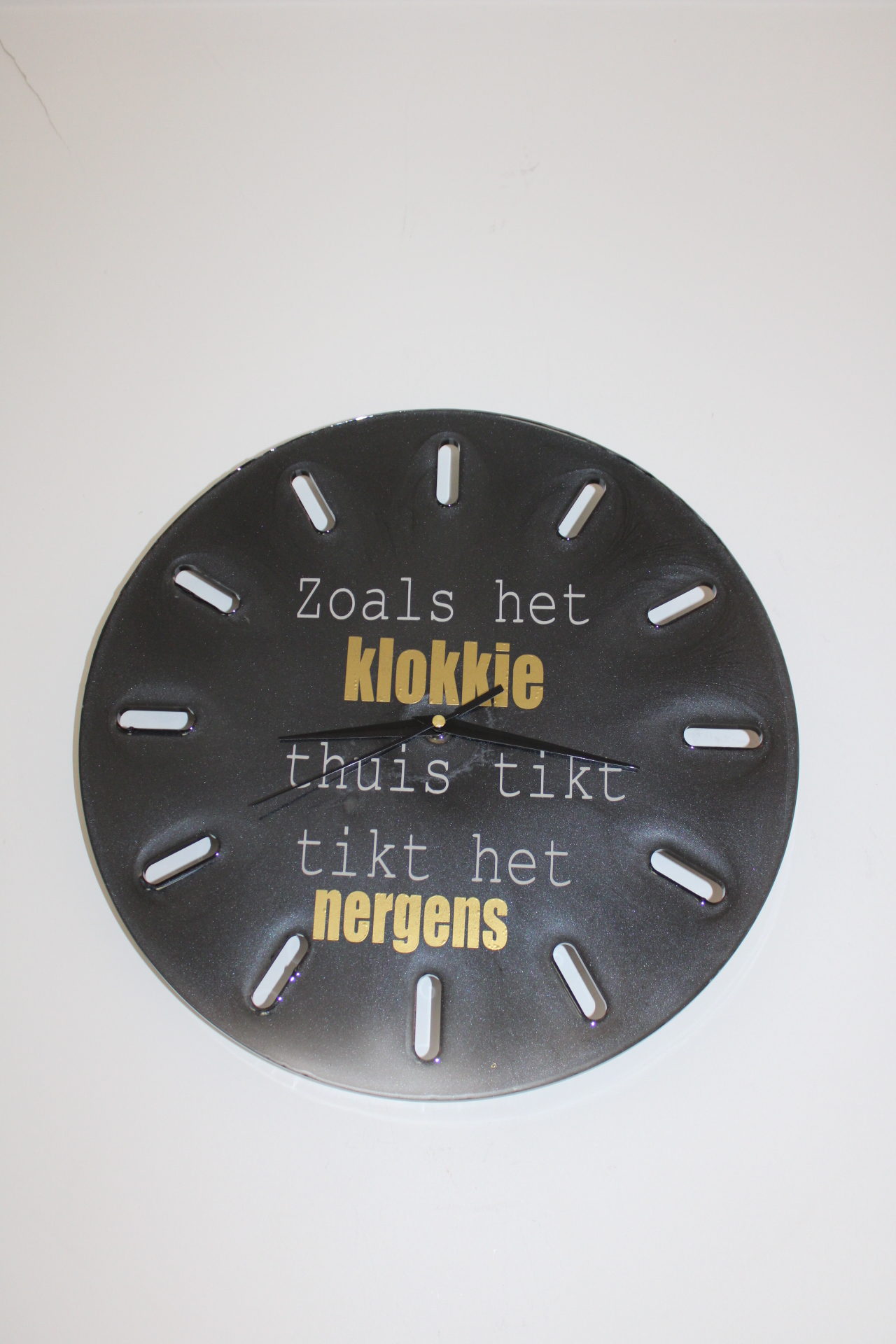 Klok Epoxy Stoere wandklok met de quote “Zoals het thuis tikt, tikt het nergens”. Tijdloos ontwerp met een warme knipoog. Tip: Kies wijzer- en tekstkleur passend bij je interieur. Herinnering Blok Opa Letter T