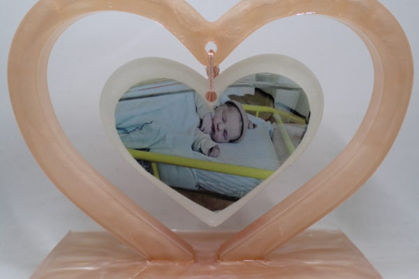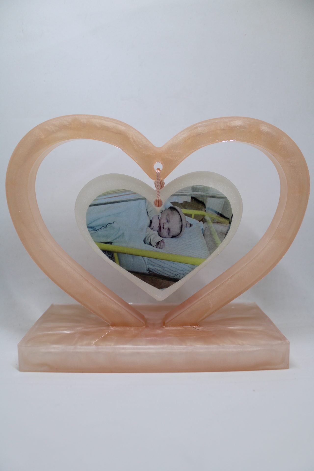 Hangend Hart met foto Epoxy Open epoxy hart met hangend fotohart — een stijlvolle manier om je favoriete foto te tonen. Tip: Voeg naam/jaartal toe of kies een tint die matcht met je interieur. Hangend Hart Geboorte Plaat Geboorte