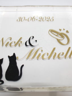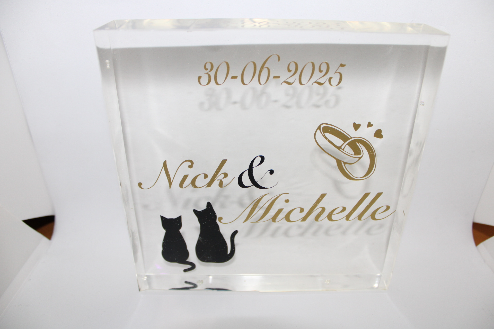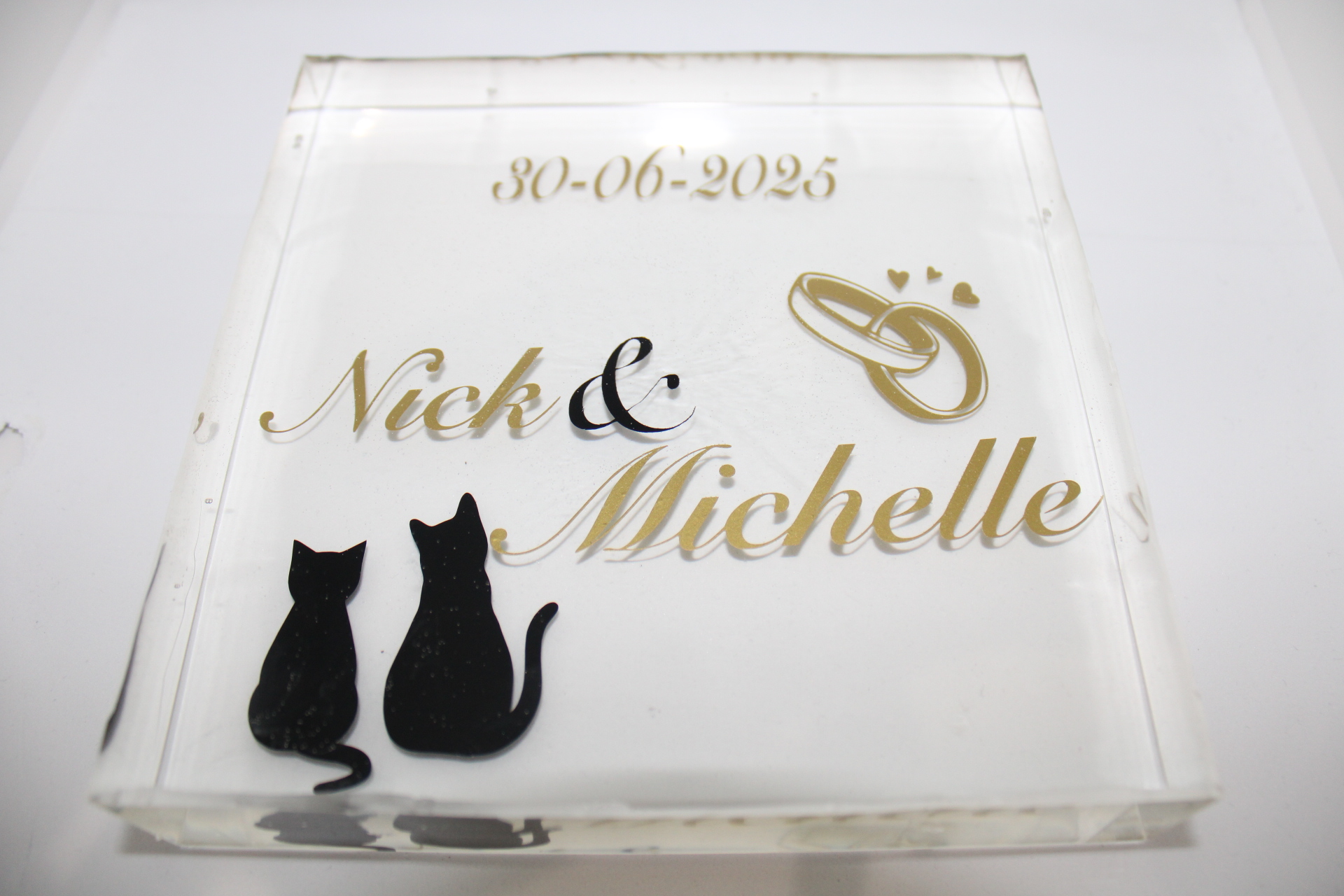 Herinnering Blok Trouw Epoxy Heldere epoxy block met namen, datum en trouwsymbolen (ringen/icoon). Stijlvolle, blijvende herinnering aan jullie dag. Tip: Voeg bloemaccenten, mini-iconen (bv. katten) of een eigen kleurthema toe. Schaal Groen Hangend Hart Geboorte