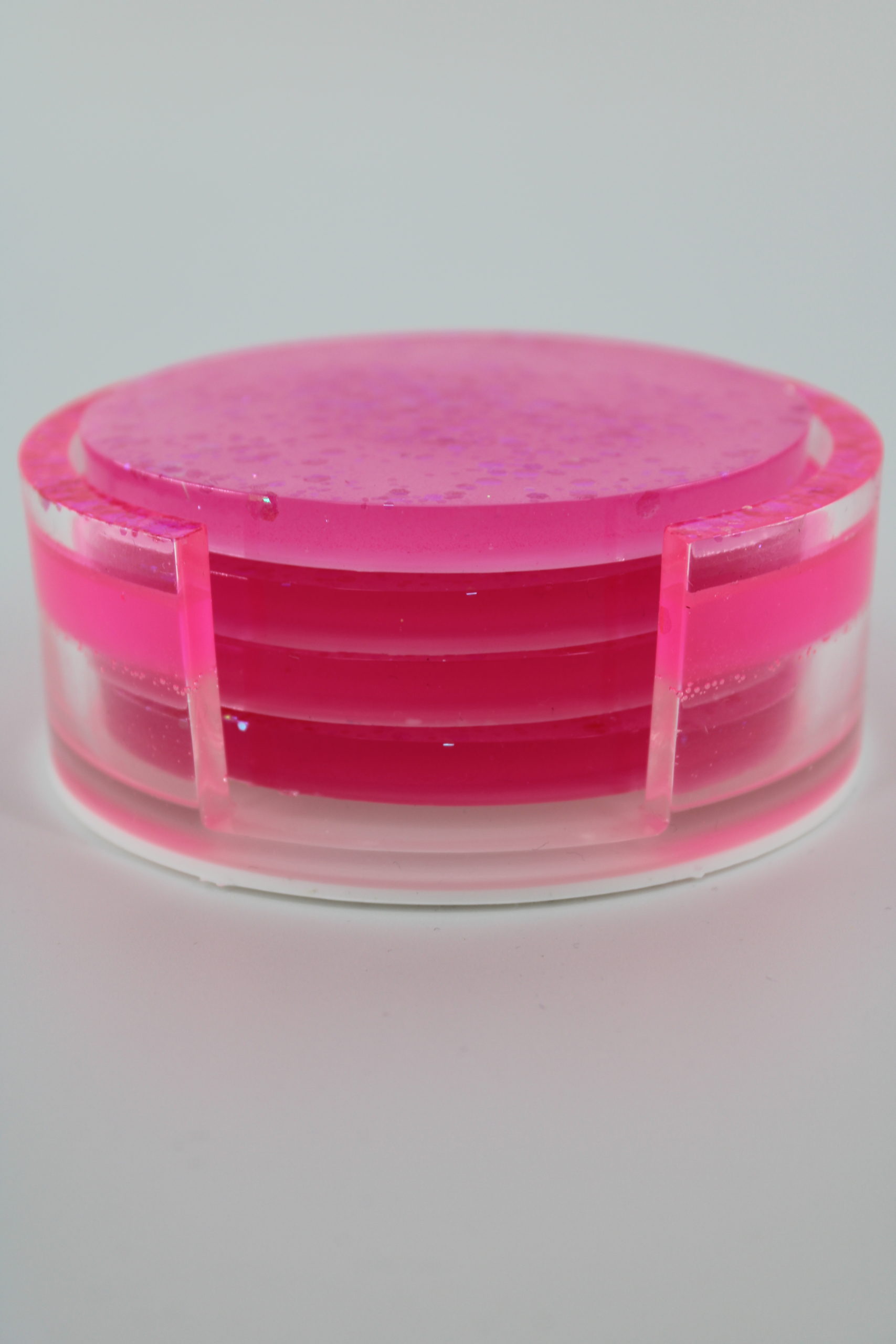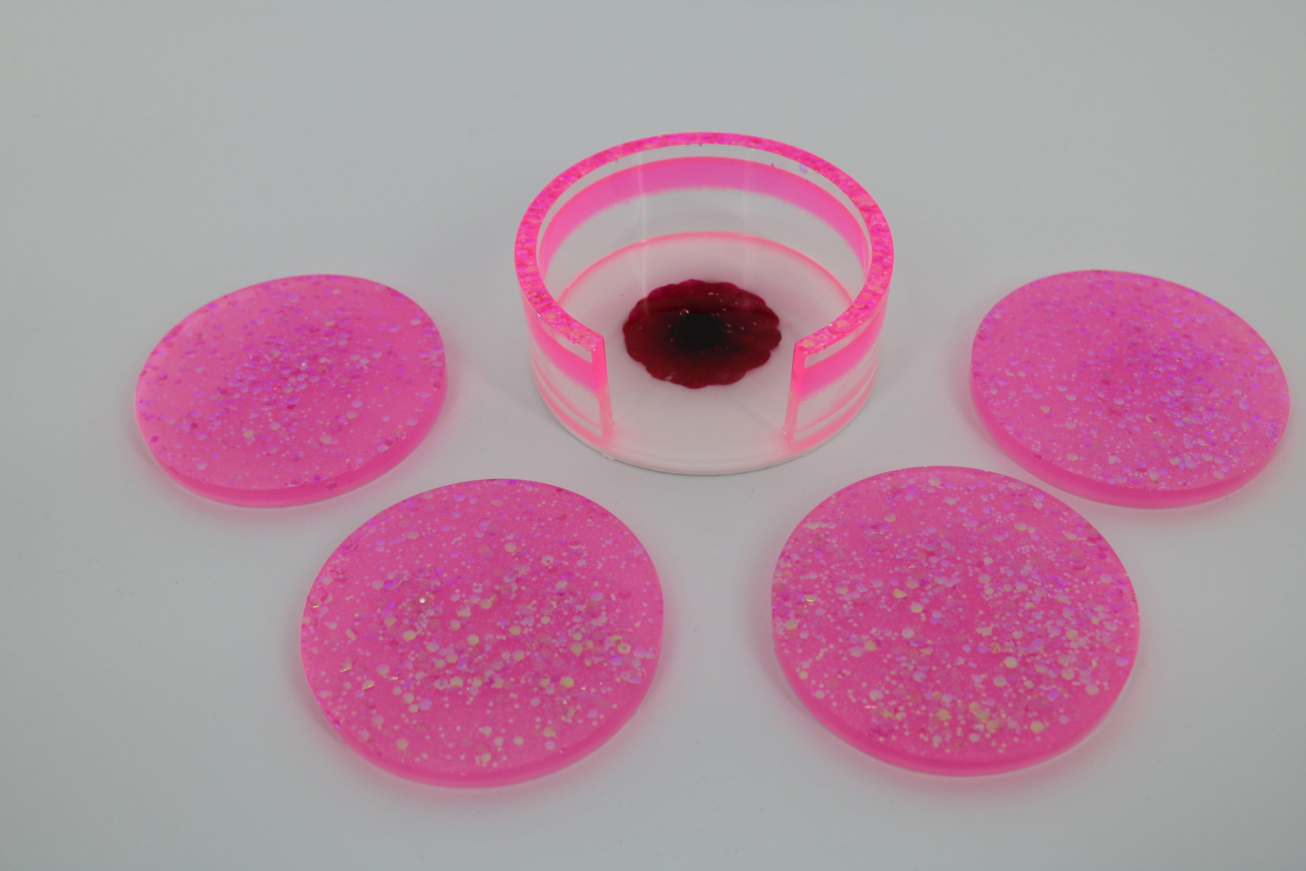 Onderzetters roze bloem Epoxy Epoxy onderzetters in felroze met glitter, gecombineerd met een bijpassende houder. Onderzetters bloem Onderzetters wit met glitter