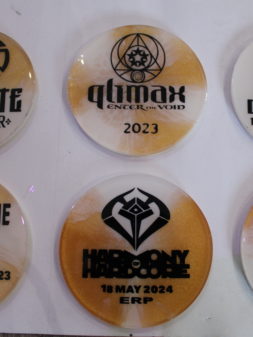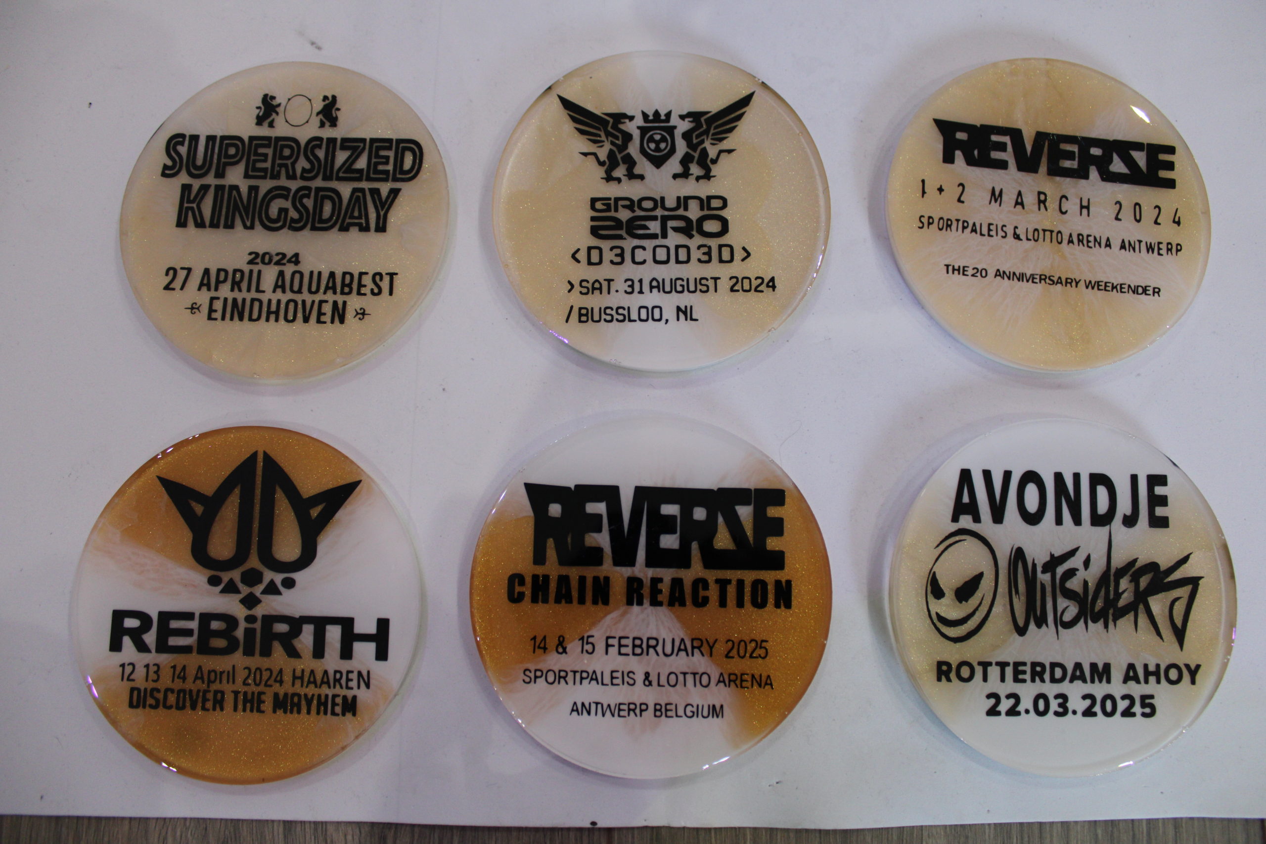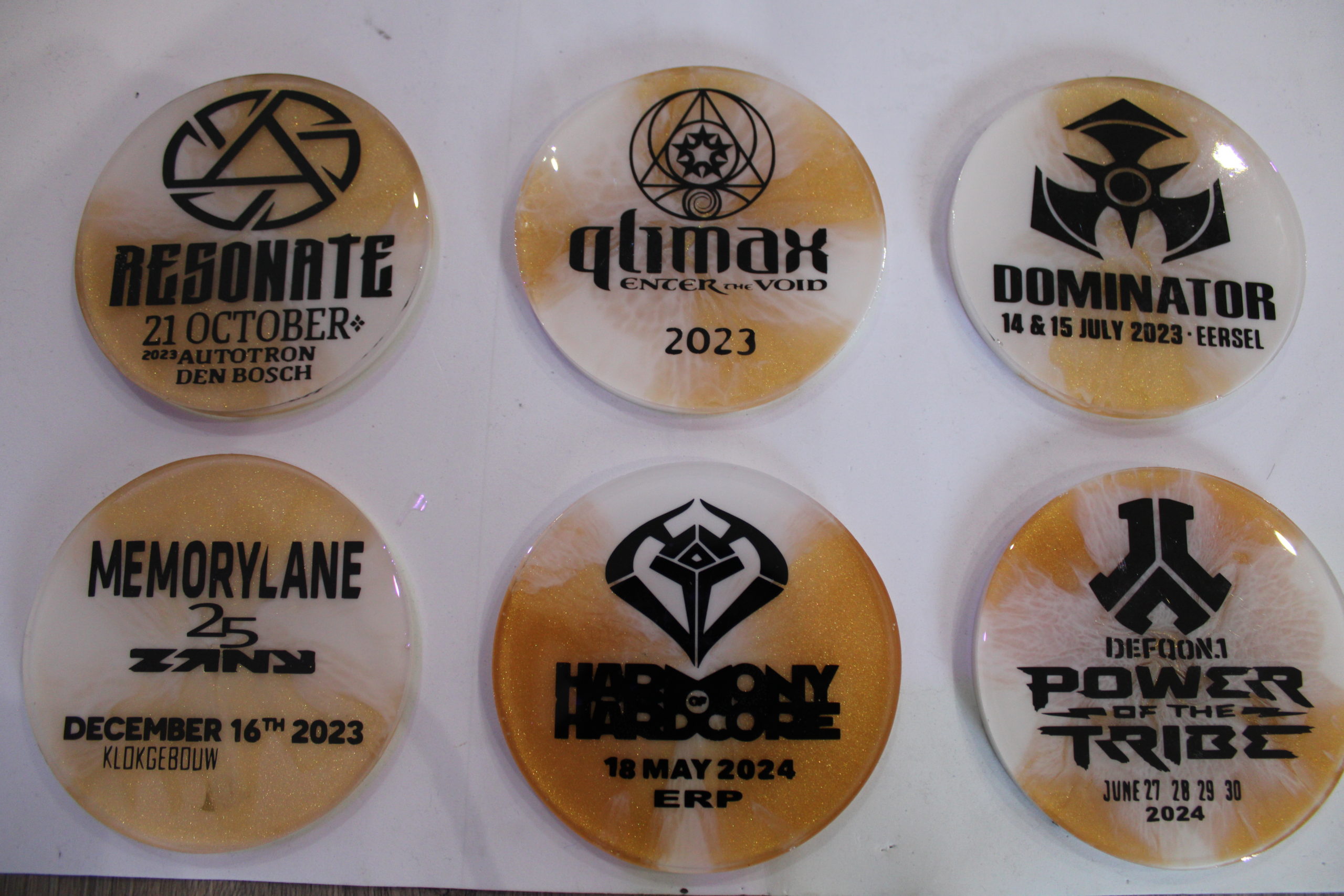 Ronde epoxy onderzetters met festival-logo’s, data en locaties in goud- en wittinten.