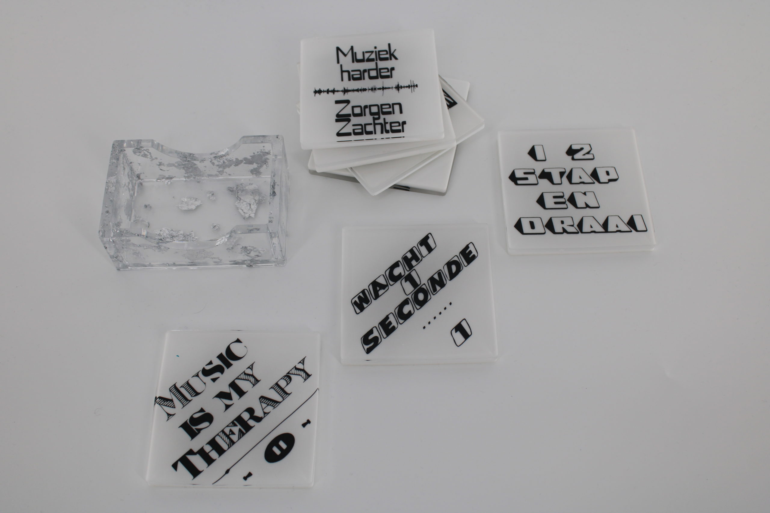 Onderzetters quotes Epoxy Witte epoxy onderzetters, elk met een unieke quote. Onderzetters regenboog Onderzetters zwart roze