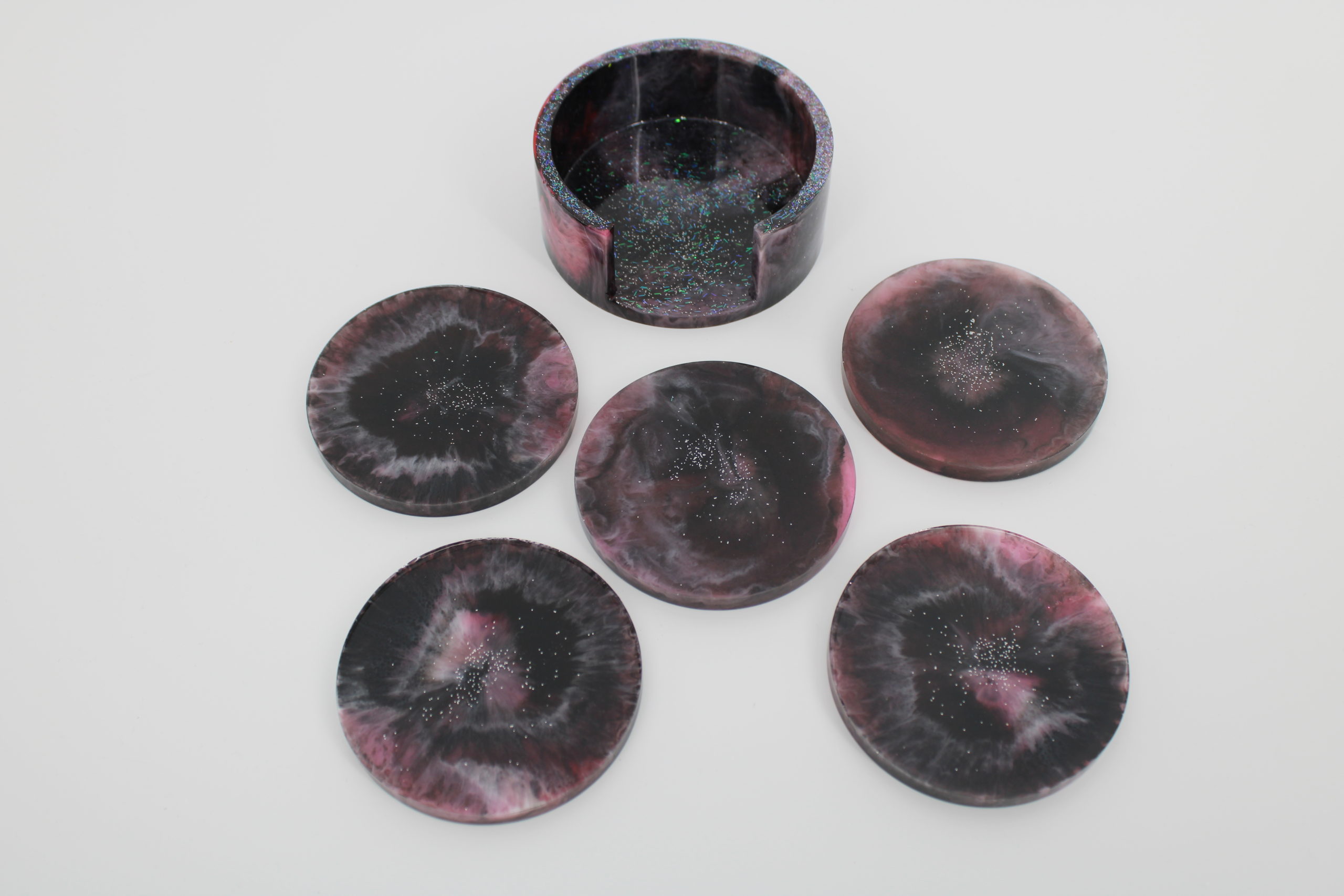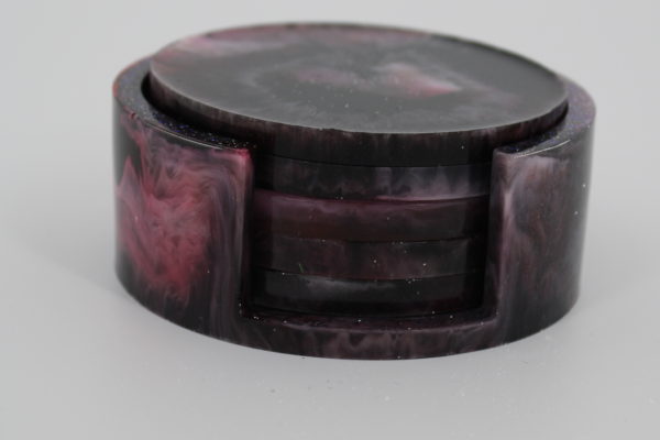 Donkere epoxy onderzetters met roze accenten.