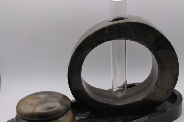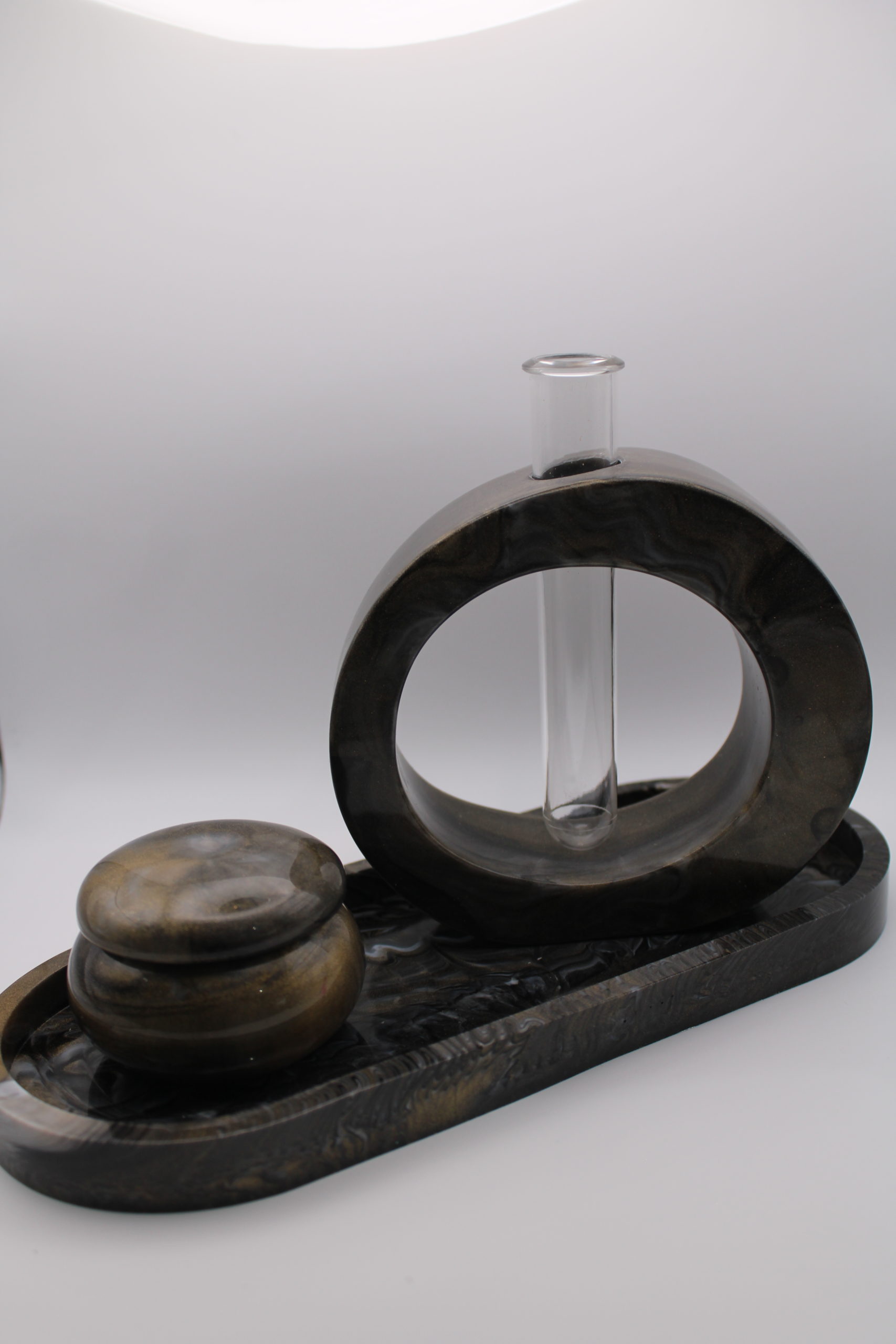 Potje donker Epoxy Epoxy potje met bijpassend deksel in donkerbruine tinten. Perfect als decoratief object of voor kleine spullen. Tip: Verkrijgbaar als set met bijpassende dienblad en vaas. Potje roze druppel Schaal donker