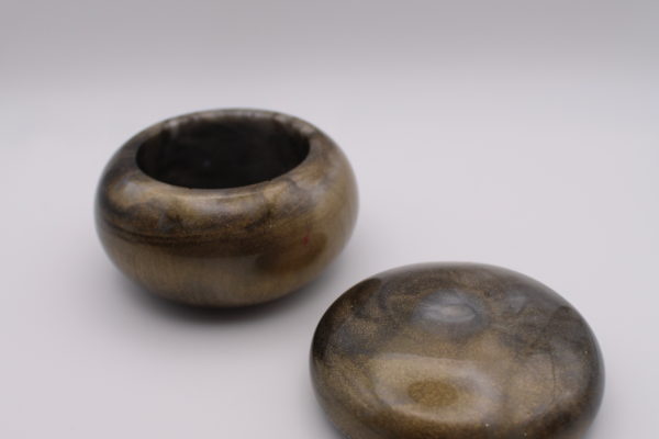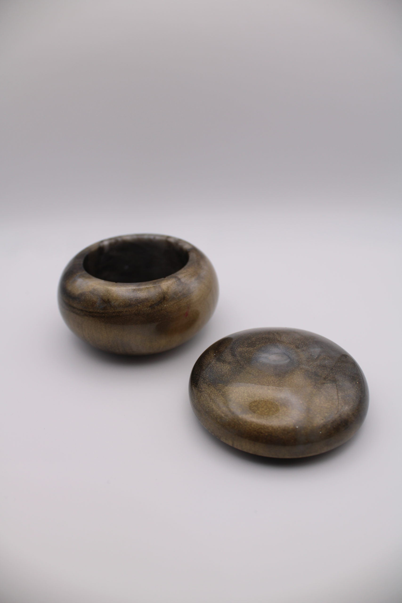 Potje donker Epoxy Epoxy potje met bijpassend deksel in donkerbruine tinten. Perfect als decoratief object of voor kleine spullen. Potje roze druppel Schaal donker