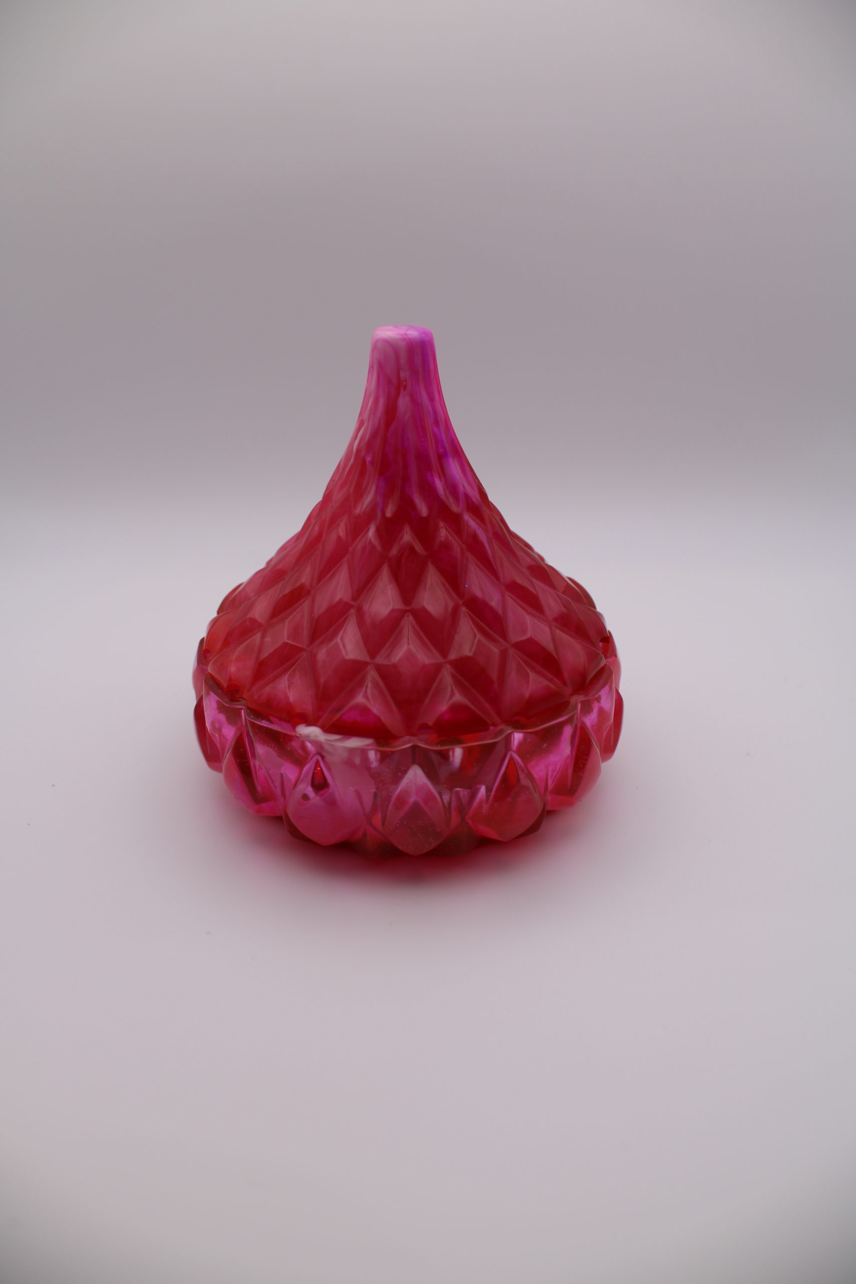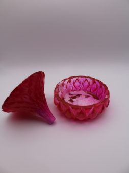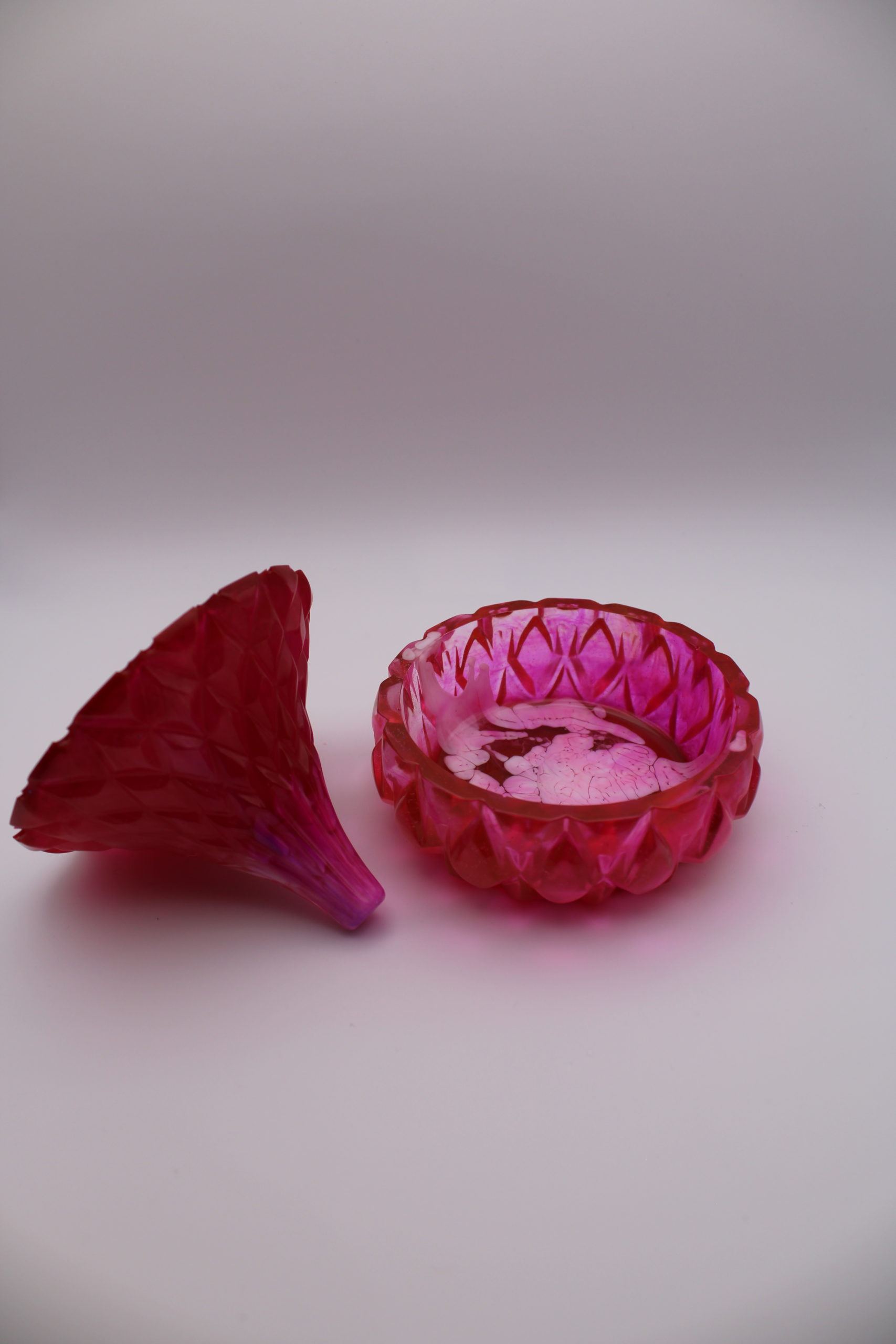 Decoratieve epoxy potje in levendige roze tinten met een unieke vorm.