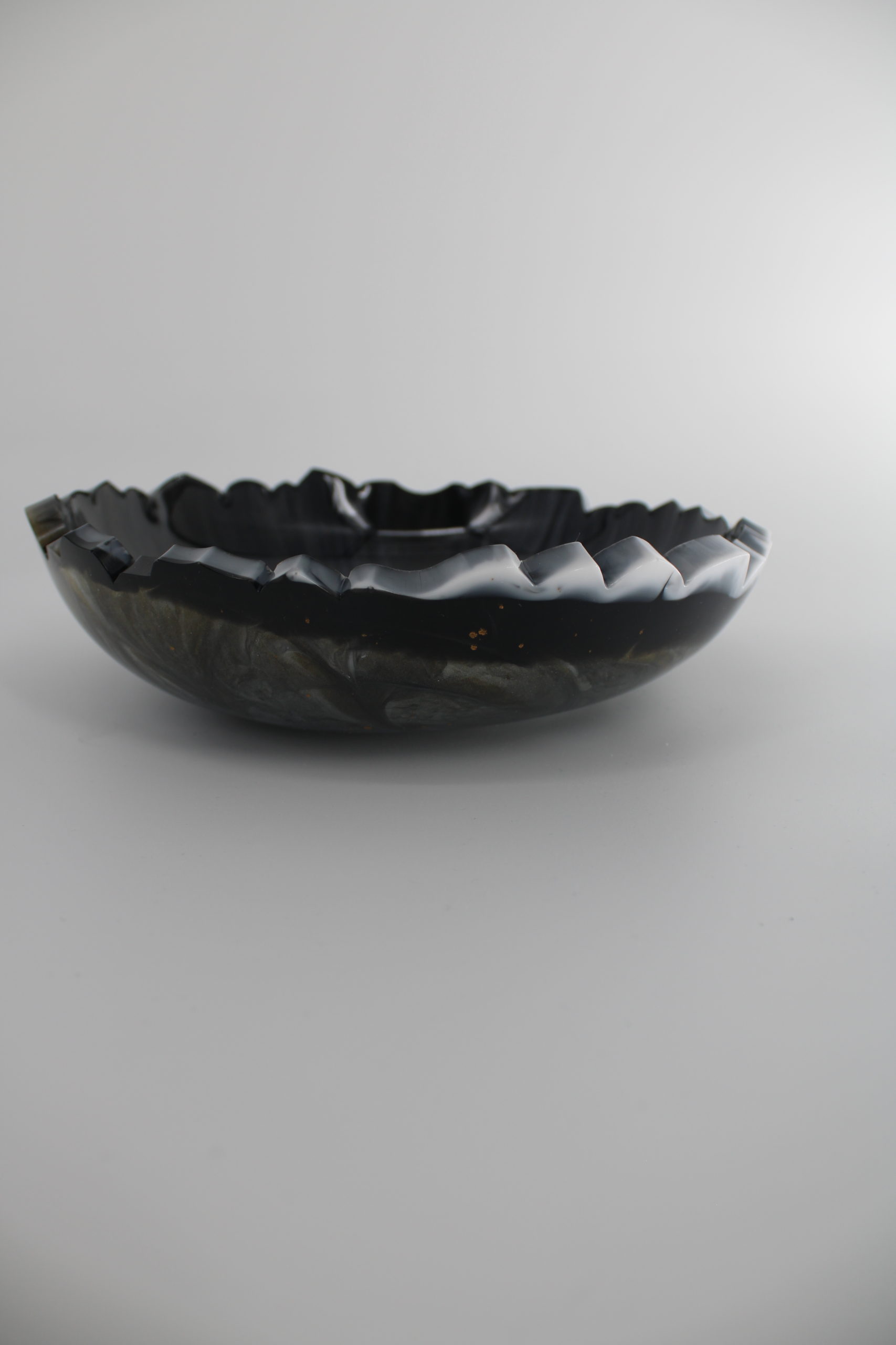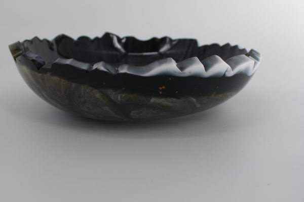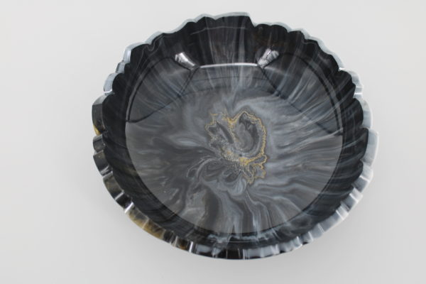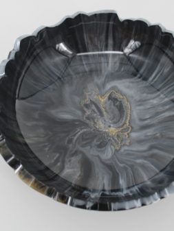 Schaal Goud zwart wit Epoxy Stijlvolle epoxy schaal in diepe zwart- en grijstinten met een zachte glans en unieke rand. Schaal goud zwart Schaal sage