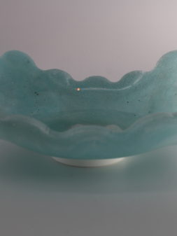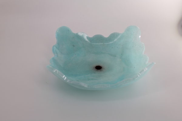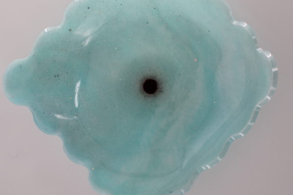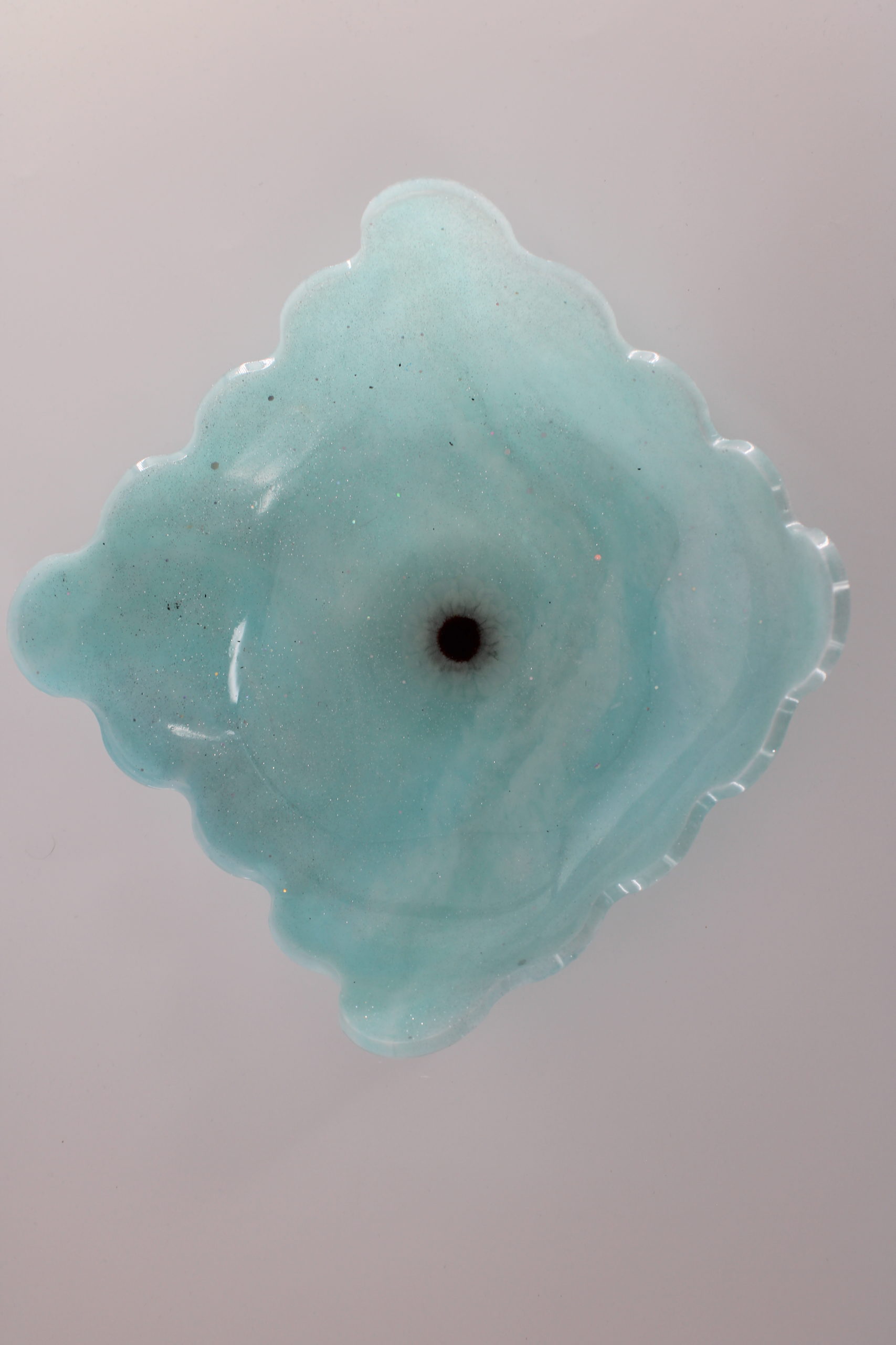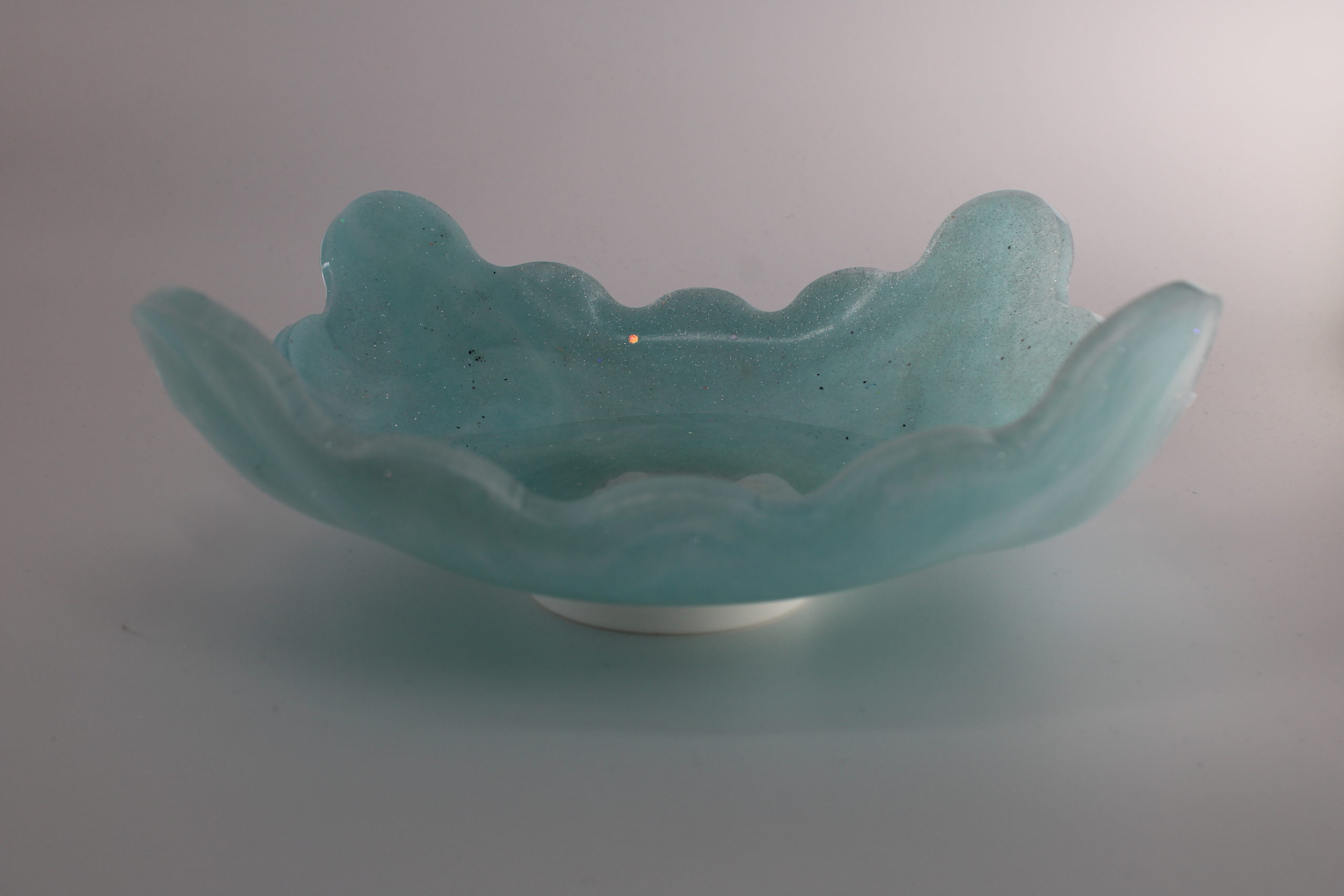 Lichtblauwe epoxy schaal met een golvende rand, geschikt voor decoratie of het opbergen van sieraden.